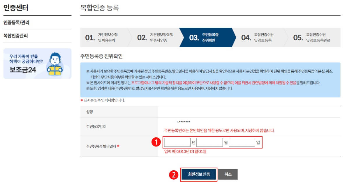 3. 주민등록번호 입력한 다음 인증서로 본인 확인